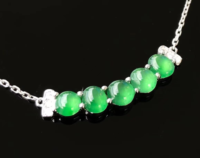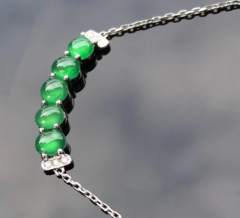 五粒同料冰地滿綠翡翠小蛋面,種老水足,起熒光,色澤均勻柔和顯內斂