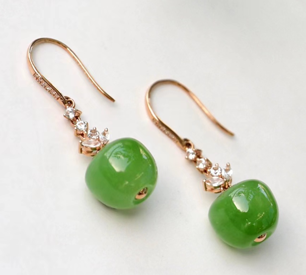玫瑰金配鑽設計成花型裝飾的耳鉤款,讓碧玉呈現出時尚輕奢的味道,又不失優雅內斂,易於佩戴。