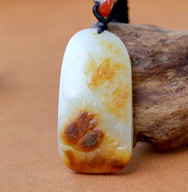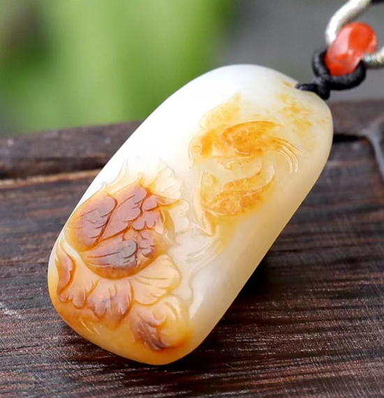 天然灑金皮籽料白玉,玉質細膩溫潤,油性足。最大的特色在於,皮色非常鮮豔,佩戴上身,色彩喜慶豔麗