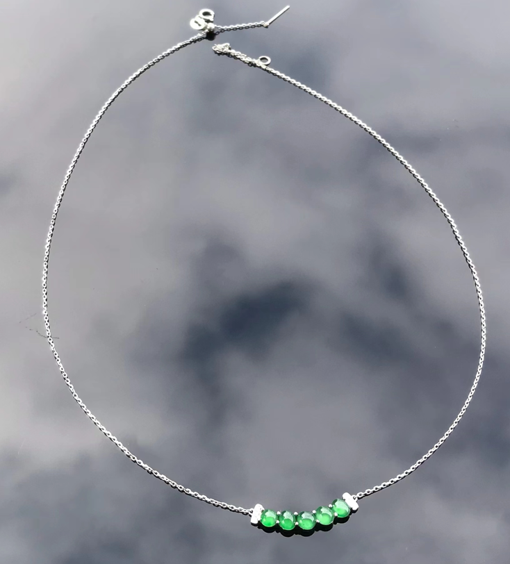 佩戴頸間,從不同的角度觀看,五粒蛋面均在同一位置散發出熒光,熒光流動,很是別緻。既可當做鎖骨鏈,又可起到吊墜佩戴效果,搭配服飾輕鬆駕馭。