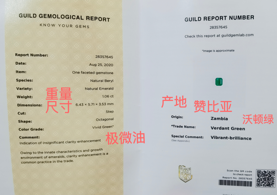 附帶英文國際證書——吉爾德證書(美國GUILD(吉爾徳)寶石實驗室)。