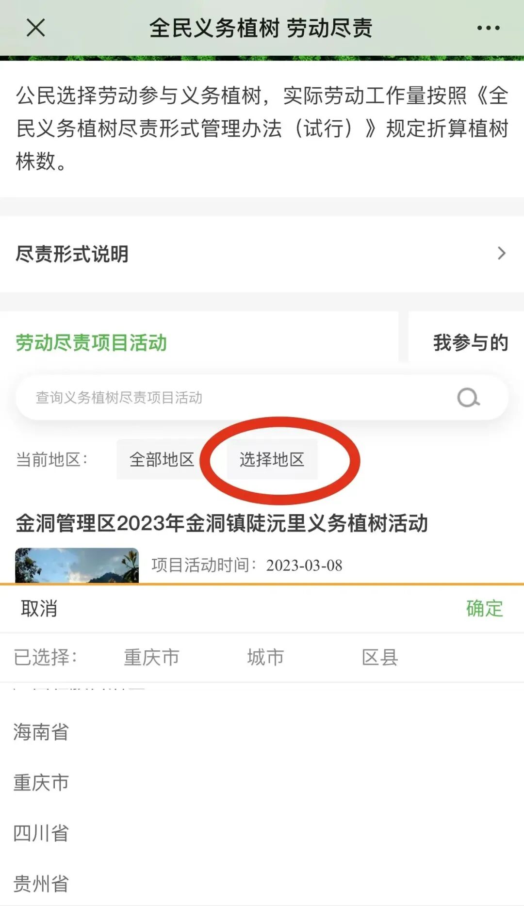 2.點擊下方菜單欄“盡責參與”,在彈出的菜單欄裡點擊“勞動盡責”;跳出頁面後點擊“選擇地區”,選擇適合的基地。