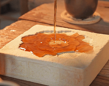 倒下的茶水,如高山流水傾瀉下來,眼前這塊漢磚茶臺全盤吸收,真真是奇妙!
