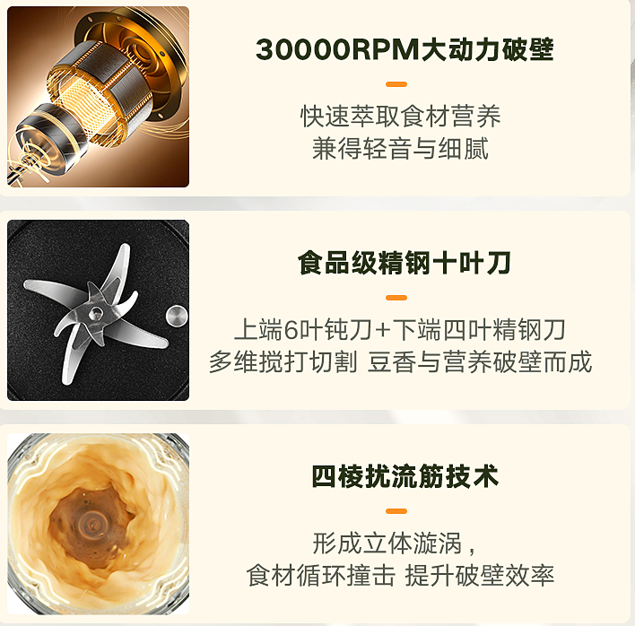 30000轉/分鐘大動力破壁,配合多層10葉刀片,幹豆直打都無需濾渣,豆漿細膩不卡喉。