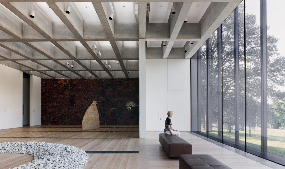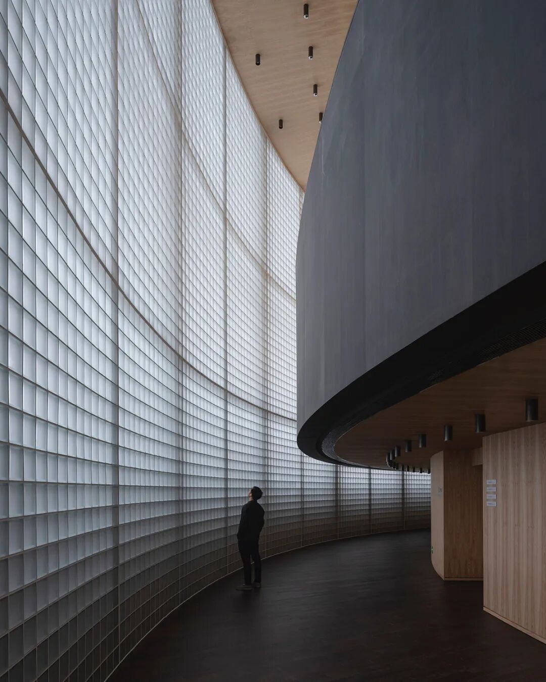 新館建在坡地上,被一個巨大的自然公園的竹林環抱,遠眺低處山谷的田野。展廳堅實的建築形式嵌入在中央庭院和周圍公園的濃密景觀中,植被延伸至綠化屋頂。建築組群表面粉飾紅赭色塗料,與場地山坡上的黏土顏色相近,強化了建築和景觀之間的聯繫。