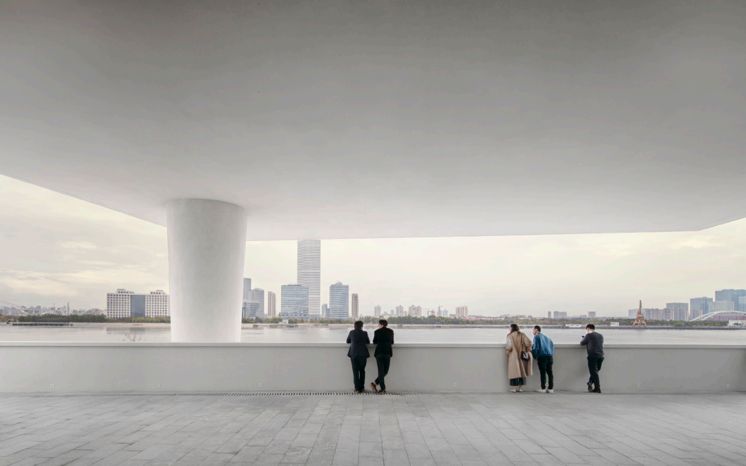 圍繞該建築的地面廣場被抬升至洪泛區之上,黃浦江景緻一覽無餘。順著廣場東側邊緣的臺階而下,可至鄰近河岸的休息平臺。該建築不僅是矗立於項目基地上的一座獨立建築,也扮演優化基地與黃浦江、公園之間聯繫的公共角色。