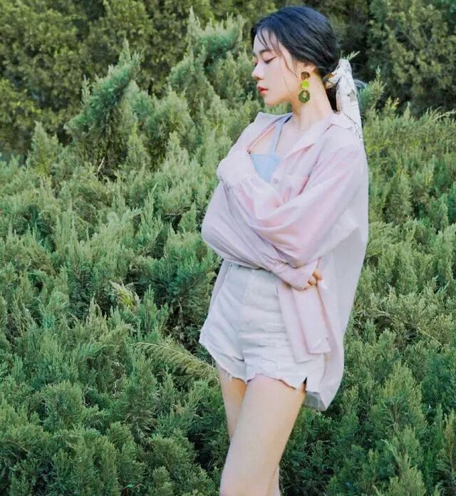 輕薄的外衫穿搭,很有夏天的感覺,搭配吊帶款式的小襯衫,又能很好地展露出優美的鎖骨,白粉色的深薄外衫,真的極為素雅,但素雅之中又不失潮流,白色短褲的映襯,和輕薄的外衫融為一體,顯得極為乾淨雅緻,綠色耳環的點綴,將皮膚的顏色襯托得更為白皙,不得不說,這身的搭配更加時尚。張紫寧的隨身搭配,休閒又雅緻,充滿了少女範,真的很有氣質。