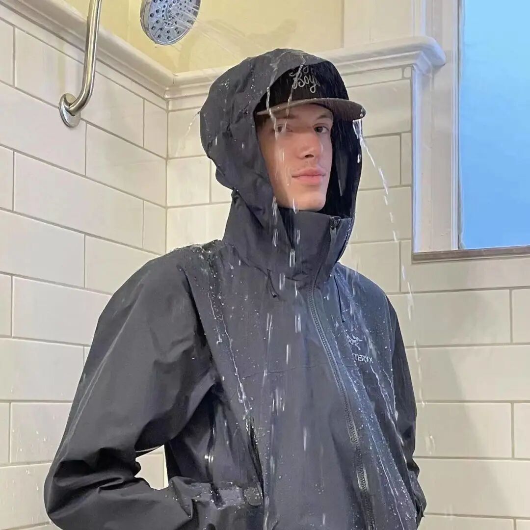 打開TikTok,還能看到這幾年大火的“始祖鳥淋浴挑戰”,身著始祖鳥衝鋒衣的老外站在淋浴噴頭下衝水,水珠滑過沖鋒衣表面,不留一絲痕跡。