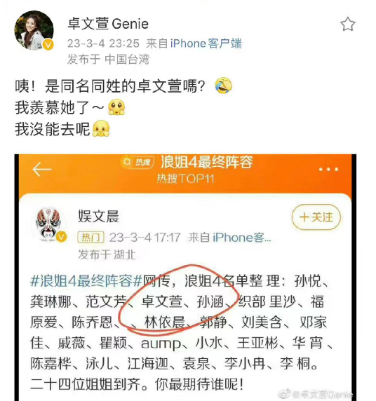 浪姐是懂營銷的,名單都爆出好幾個版本了,溜得都是大家想看的。還引來正主卓文萱在線闢謠,難道是同名同姓?