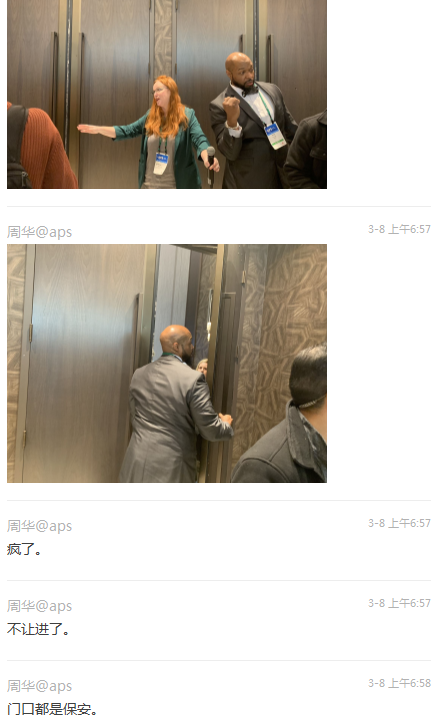 社交媒體流傳的文字聊天直播說:“APS(美國物理學會)安排失敗。房間太小。”“門口看到好些個物理界的大佬都堵在門口不讓進。”“門口保安一直晃手電,驅趕聚集的人群。”“保安持續吼叫中,驅趕人群。”