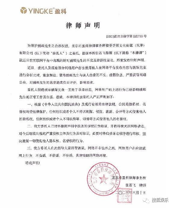 下午,姚琛方發佈律師聲明,表示有人在蓄意捏造姚琛戀愛的消息,並強調他本人一直是單身的狀態。