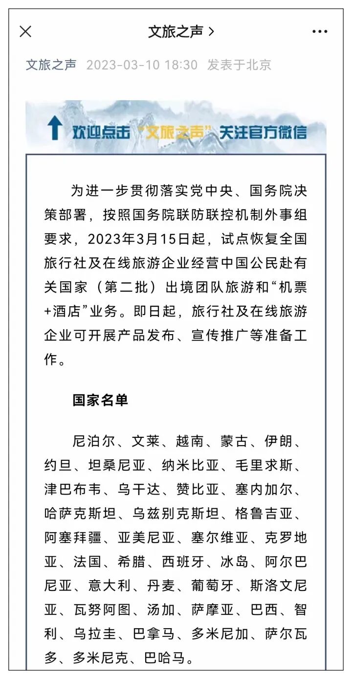 “2023年3月15日起,試點恢復全國旅行社及在線旅遊企業經營中國公民赴有關國家(第二批)出境團隊旅遊和‘機票+酒店’業務。即日起,旅行社及在線旅遊企業可開展產品發佈、宣傳推廣等準備工作。”剛剛,文化和旅遊部的官方微信公眾號“文旅之聲”發佈通知。