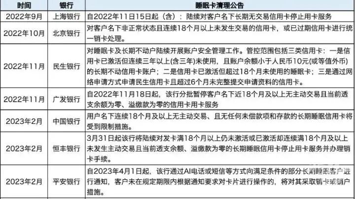 平安銀行則公告稱,將於2023年4月1日起通過AI電話或短信等方式向滿足條件的部分長期睡眠客戶進行通知,客戶未在規定期限內根據通知要求對卡片進行操作的,將對其採取銷卡或銷戶措施。
