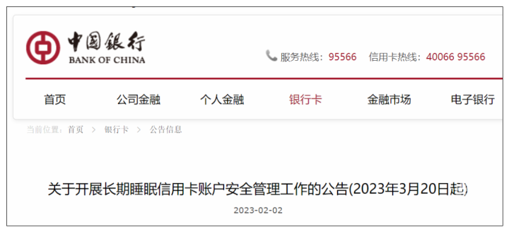 3月20日起,中國銀行將對連續18個月及以上無主動交易、且無任何未償款項和存款的長期睡眠信用卡進行降額、停用或銷卡等處理。此前,建行、招行、平安、民生、北京、浦發、興業等30餘家商業銀行陸續發佈通知,將對長期睡眠的信用卡開展賬戶安全管理等工作,主要內容為停用或銷卡。