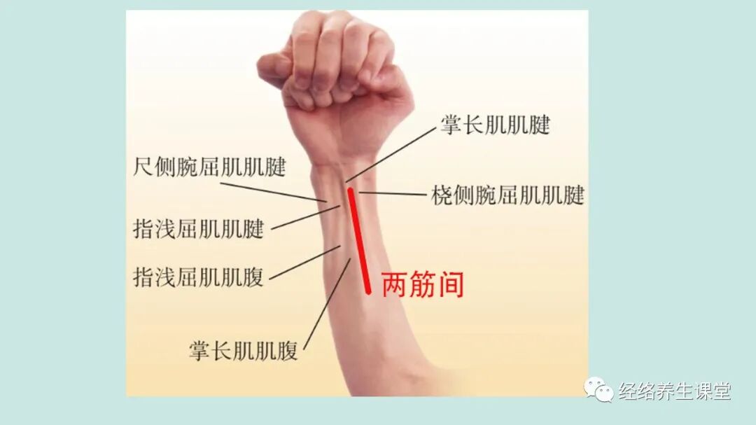 首先要找準手厥陰心包經的位置。我們攥緊拳頭,可以看見兩條筋,心包經就位於這兩條筋之間。
