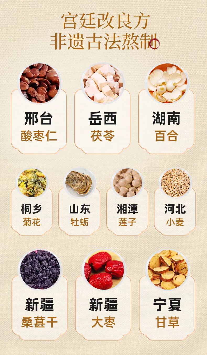 食材:酸棗仁 百合 茯苓 龍眼肉 蓮子 大棗 小麥 菊花 甘草