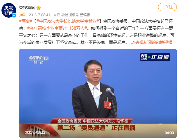 人社部部長王曉萍3月2日表示,2023年,我國高校畢業生將達到1158萬人,同比增加82萬人,招工難、就業難並存的結構性矛盾依然突出。這是在去年高校畢業生數量首破千萬後的又一新高。在今年的全國兩會上,大學生就業問題也成為代表委員的熱議話題。