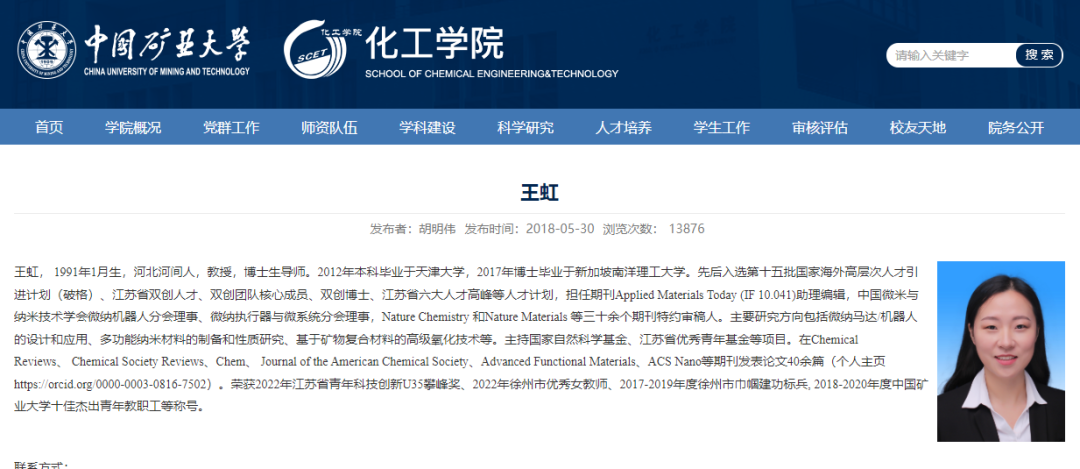 1991年出生的王虹是中國礦業大學化工學院教授、博士生導師。