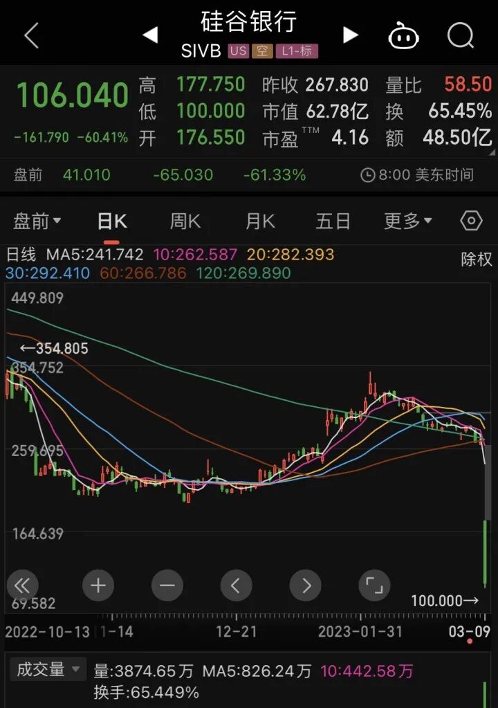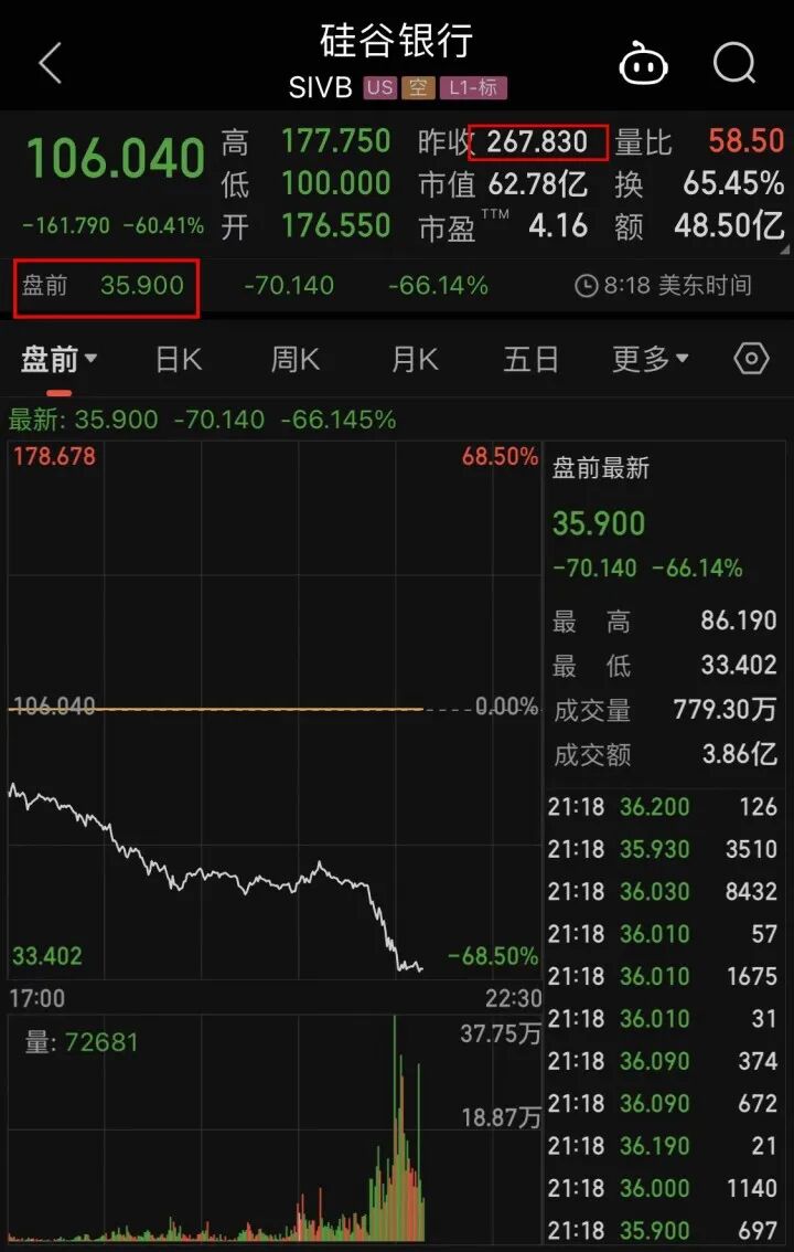 一夜間,硅谷銀行股價暴跌超過60%,創紀錄以來最大跌幅,市值蒸發超94億美元,報收於106.04美元;截至橙柿互動記者發稿,盤前已跌超60%。受其拖累,美股銀行股紛紛下挫。