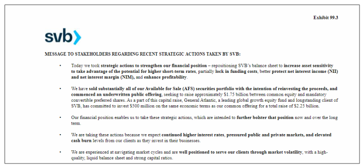 事件的起因是這樣的:當地時間週三,硅谷銀行宣佈,已經完成210億美元的債券投資組合大甩賣。由於利率上升以及一些其他因素,這筆買賣將導致18億美元的虧損。為了支撐銀行的資本基礎,硅谷銀行還表示,希望通過出售普通股和優先股,從投資者那裡募資22.5億美元補上。
