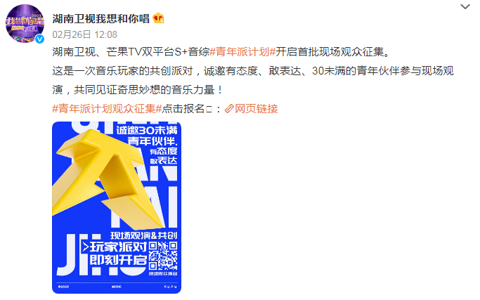 連對現場觀眾的徵集都很有要求:“這是一次音樂玩家的共創派對,誠邀有態度、敢表達、30未滿的青年夥伴參與現場觀演,共同見證奇思妙想的音樂力量!”