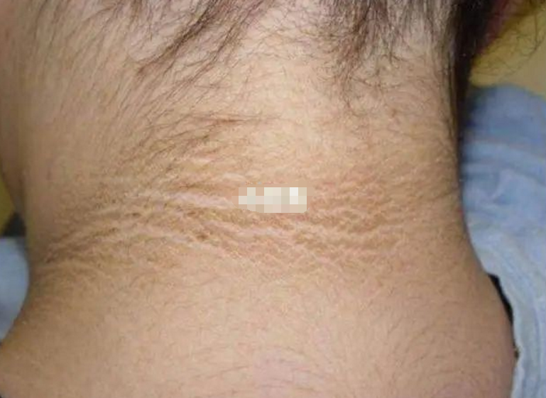 頸部的皮膚是黑色的,表現出來的樣子,如細細的黑網包裹在頸部,可能與胃癌或其他消化道癌有關。