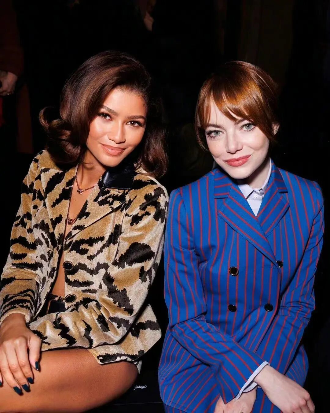 Zendaya和石頭姐在Louis Vuitton 2023秋冬秀場上合影,一個身穿豹紋裝美得野性張揚,一個藍紅條紋look高貴冷豔,兩人都星光十足。