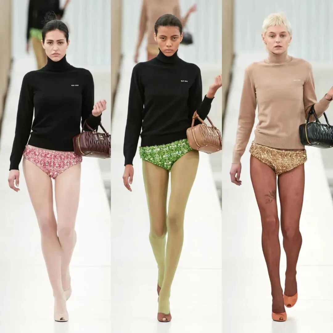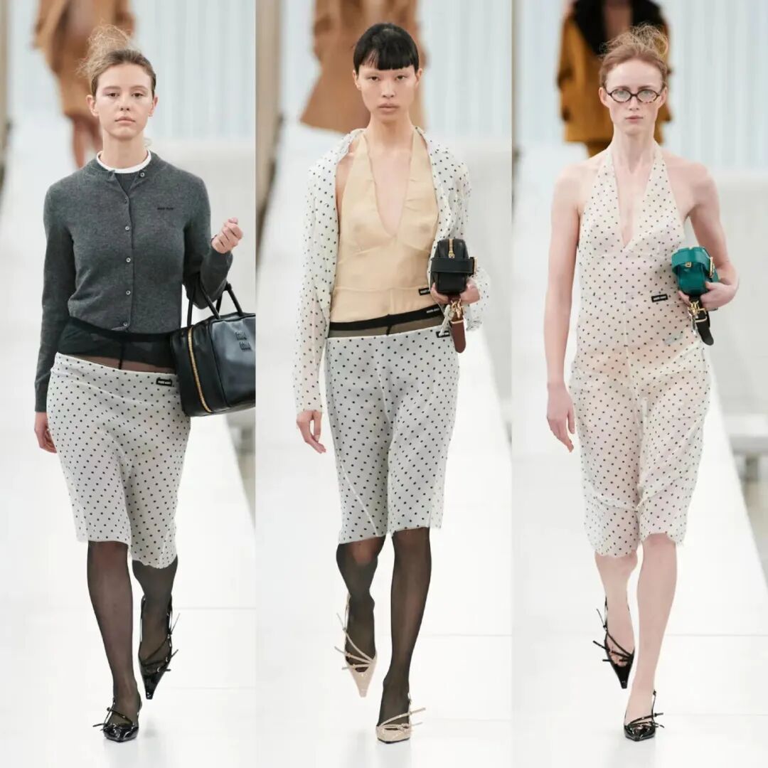 開場的look的就奠定了這次的主基調,英國女演員Mia Goth穿著灰色的針織衫拿著公文包出場,但下半身卻搭配了沒有穿戴整齊的絲襪和透視裙,嚴肅與反叛此刻又被Miuccia Prada精妙的融合,換句話說,不穿褲子的Miu Miu女孩們來了!