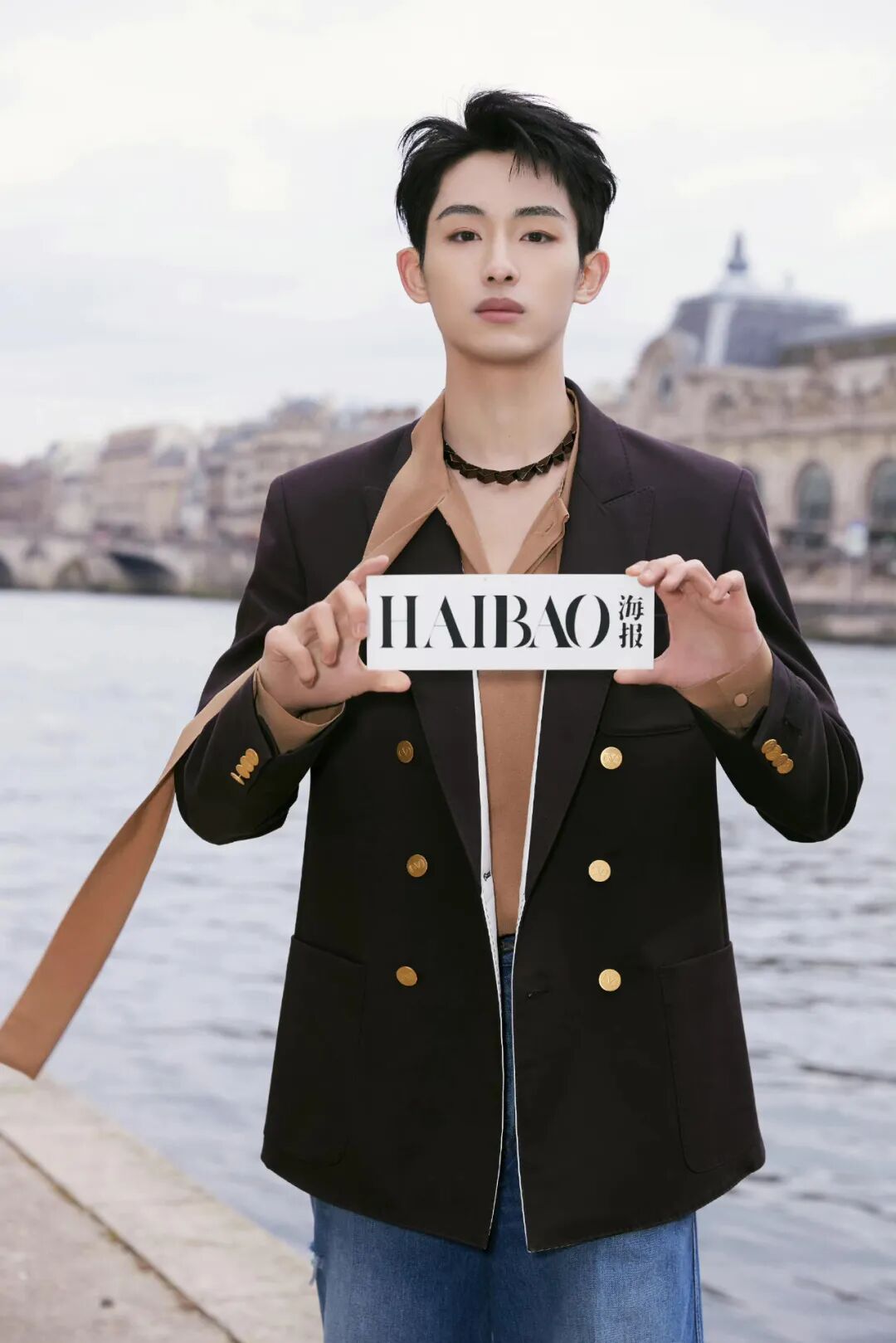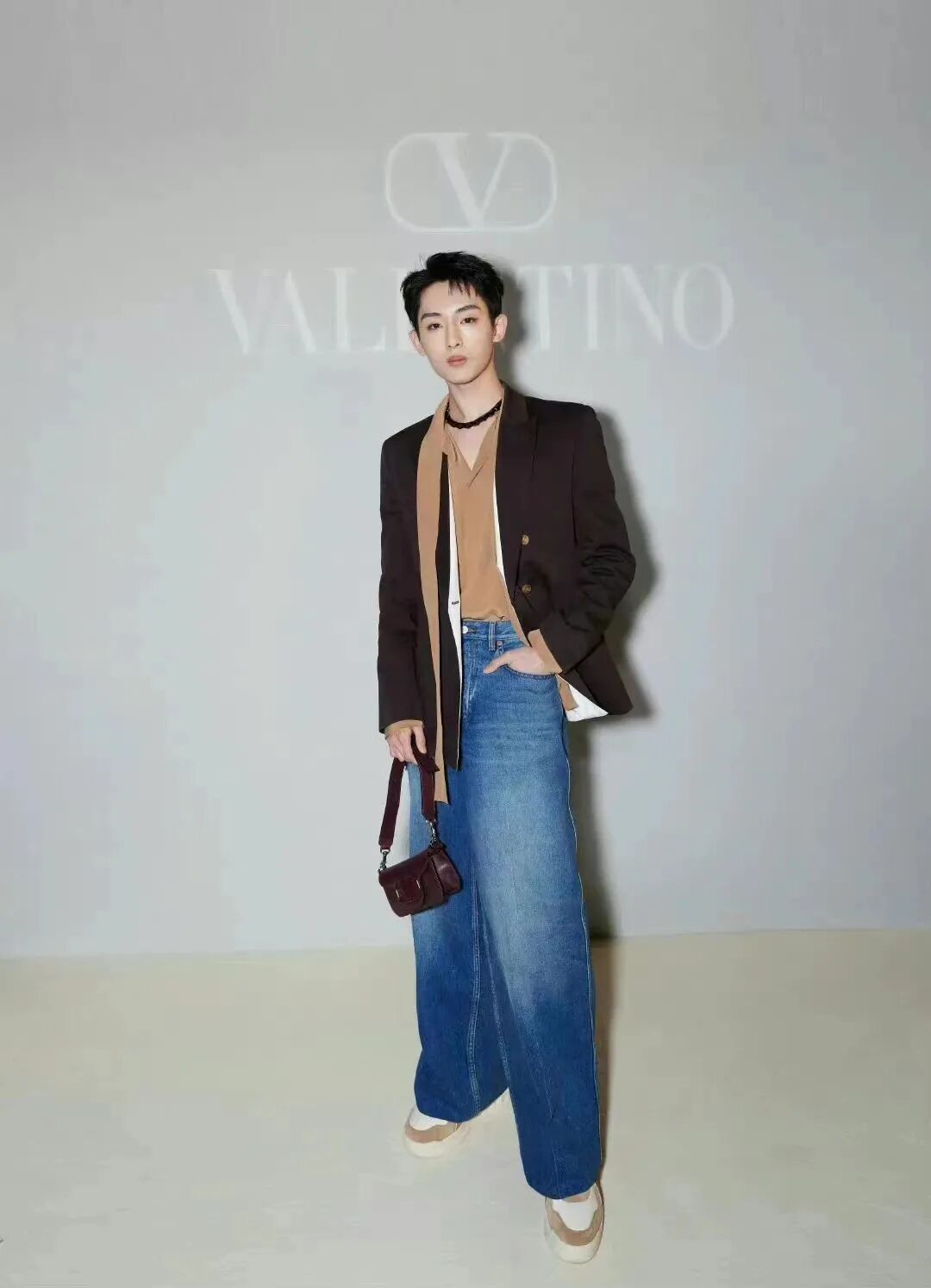 董思成的Valentino看秀look也很突出。駝色西服與休閒牛仔的混搭,兼具矜貴氣息和少年感,同色系項鍊的點綴增添一絲張揚的性感~