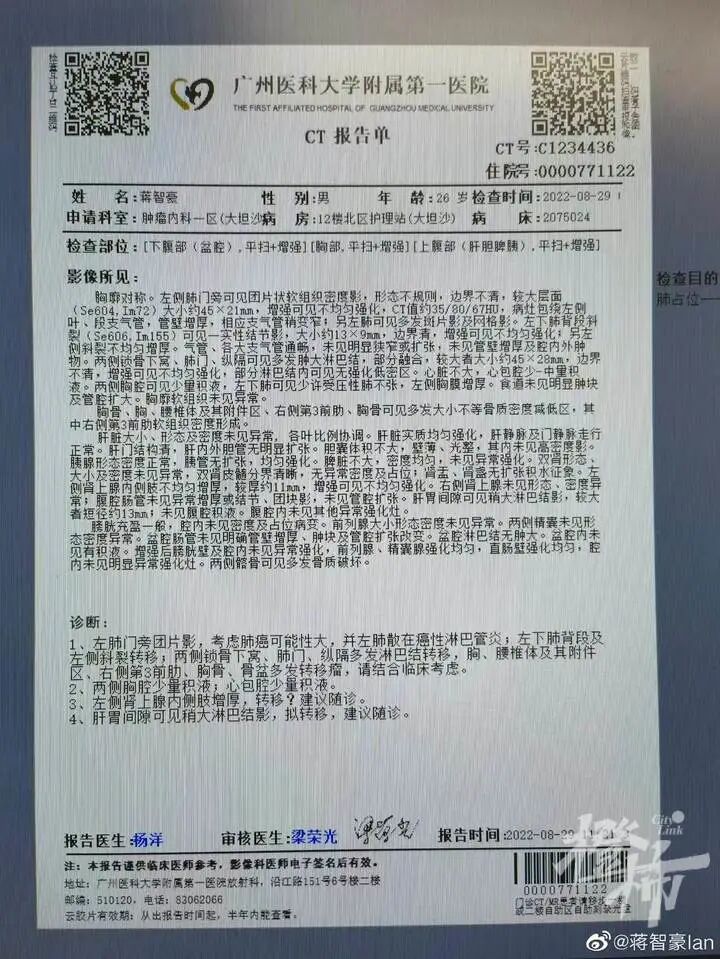 蔣智豪CT報告。(來源:蔣智豪微博)