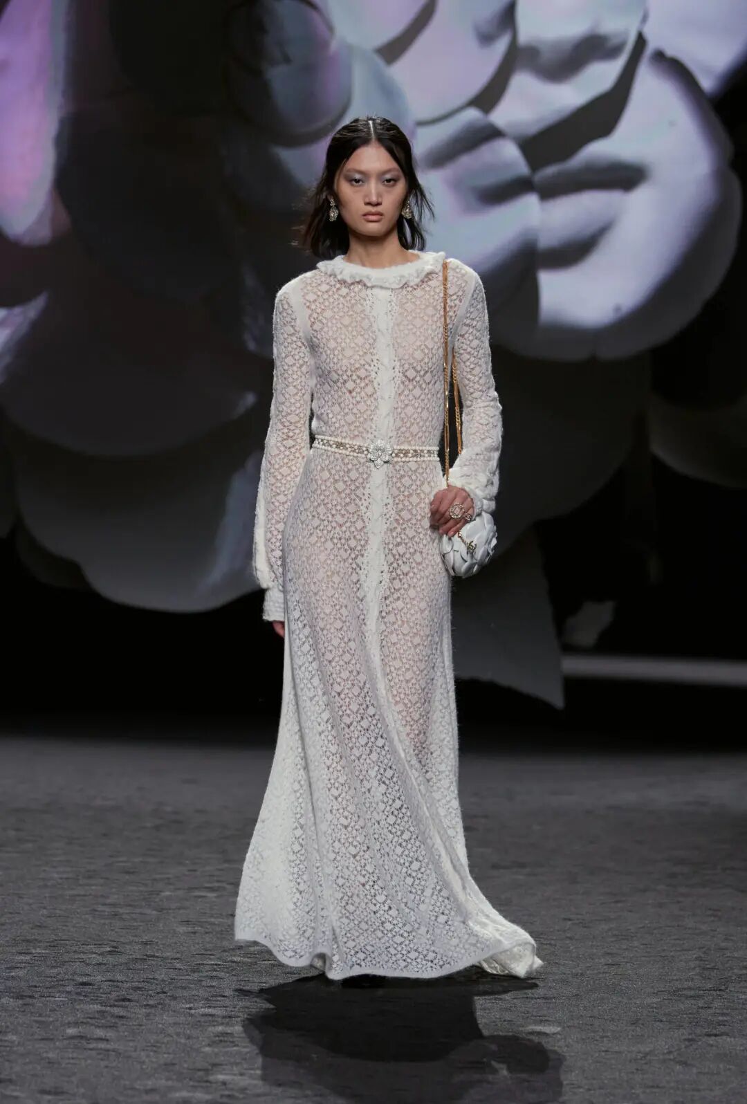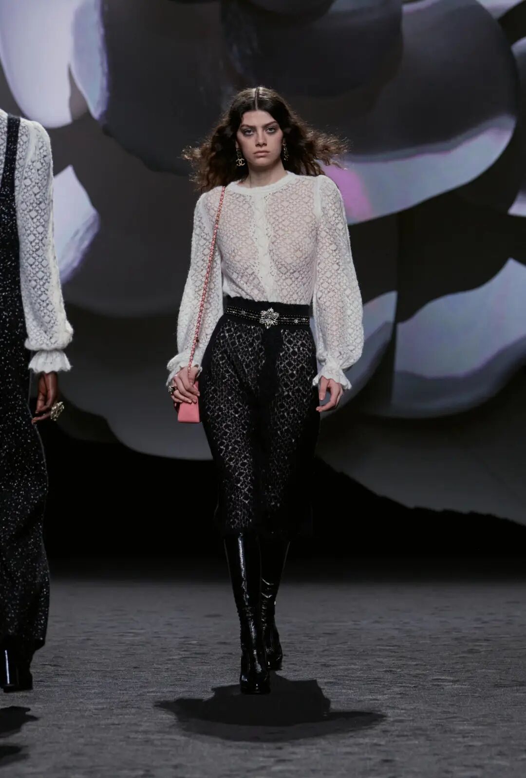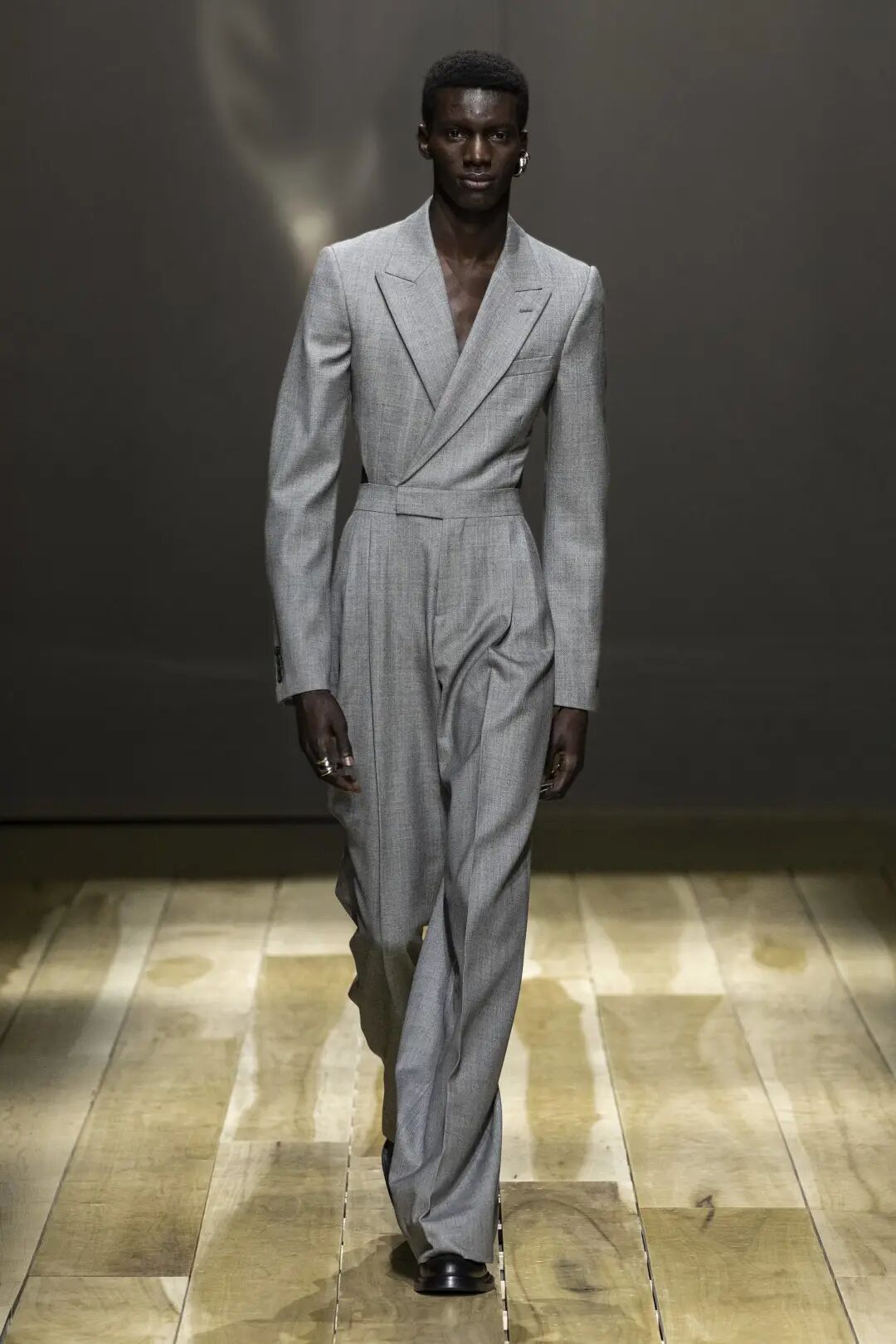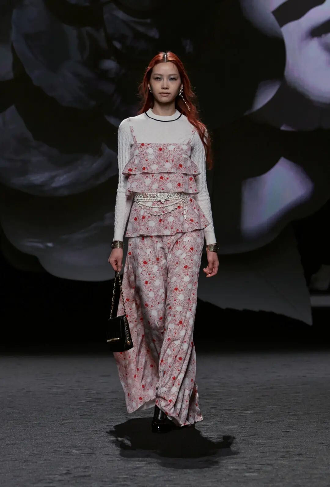 “探索人體構造、服裝解構、花卉形態。藉助精湛技藝與面料,探尋美與力量。聚焦剪裁、比例及廓形。時裝的本質源自人體結構,以此為靈感,呈現於精良剪裁之上。顛覆經典:內外翻轉,上下倒置,呈現或簡約光潔、或嚴格精確、或張揚有趣的形態。解構重塑時裝:切割、裁片、扭轉,突顯肩部廓形,收窄腰部曲線。褲子與長靴融為一體,延長腿部線條,構造出與品牌經典超低腰褲對立的廓形。作為該系列最主要的圖案,蘭花以其罕見的培植形態呈現,它是除雛菊外最常見的花卉之一。它在空氣中盛開,肆意生長,自由生根。它綺麗旖旎,極富適應性。它的姿態既像是捕獵者,又像是獵物。在花語中,它是愛的象徵。”創意總監 – Sarah Burton