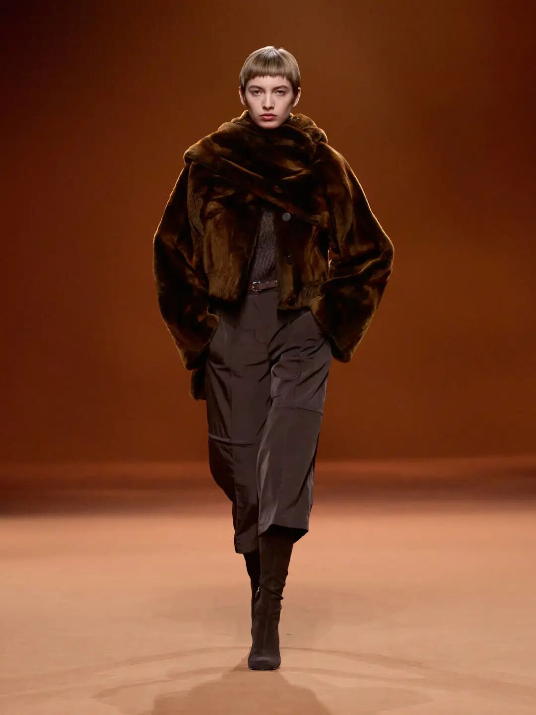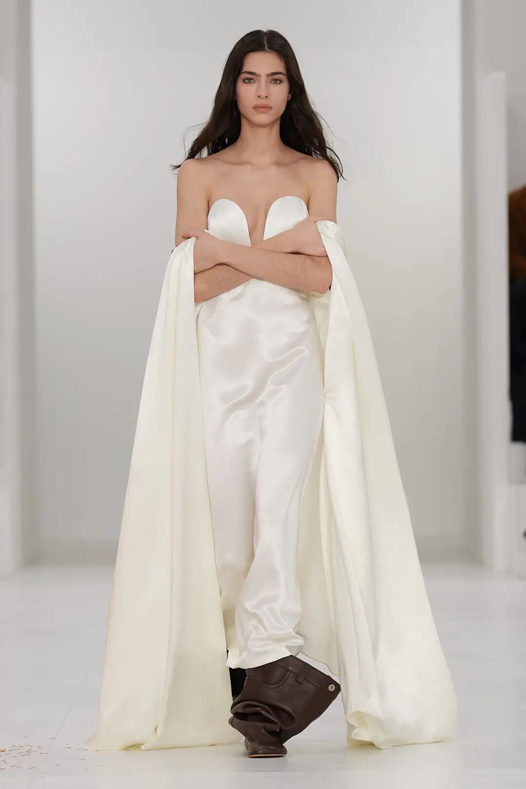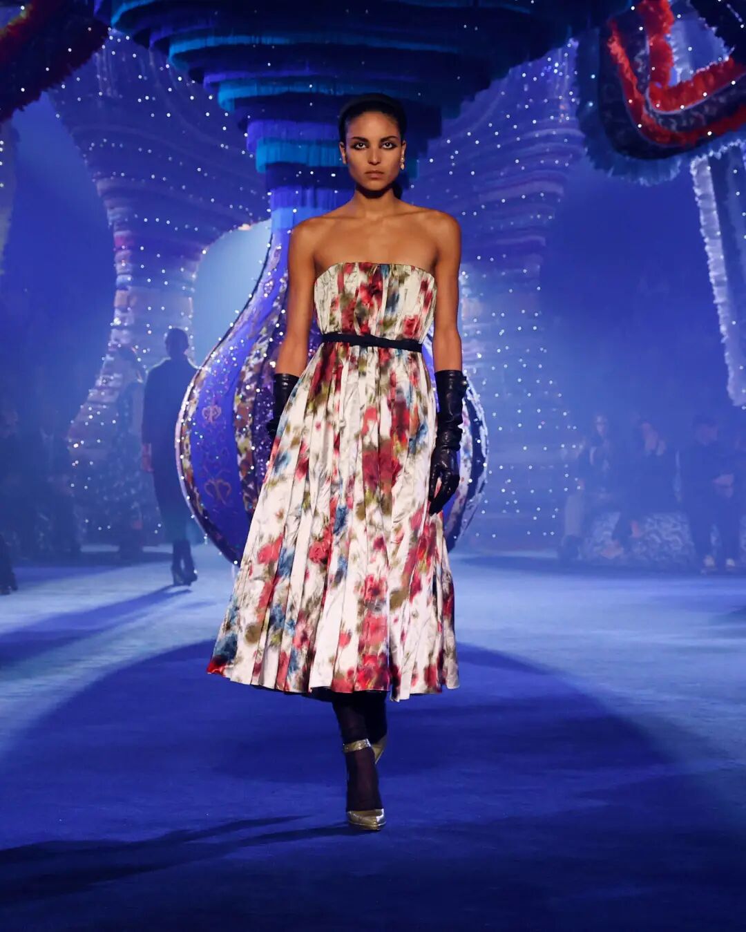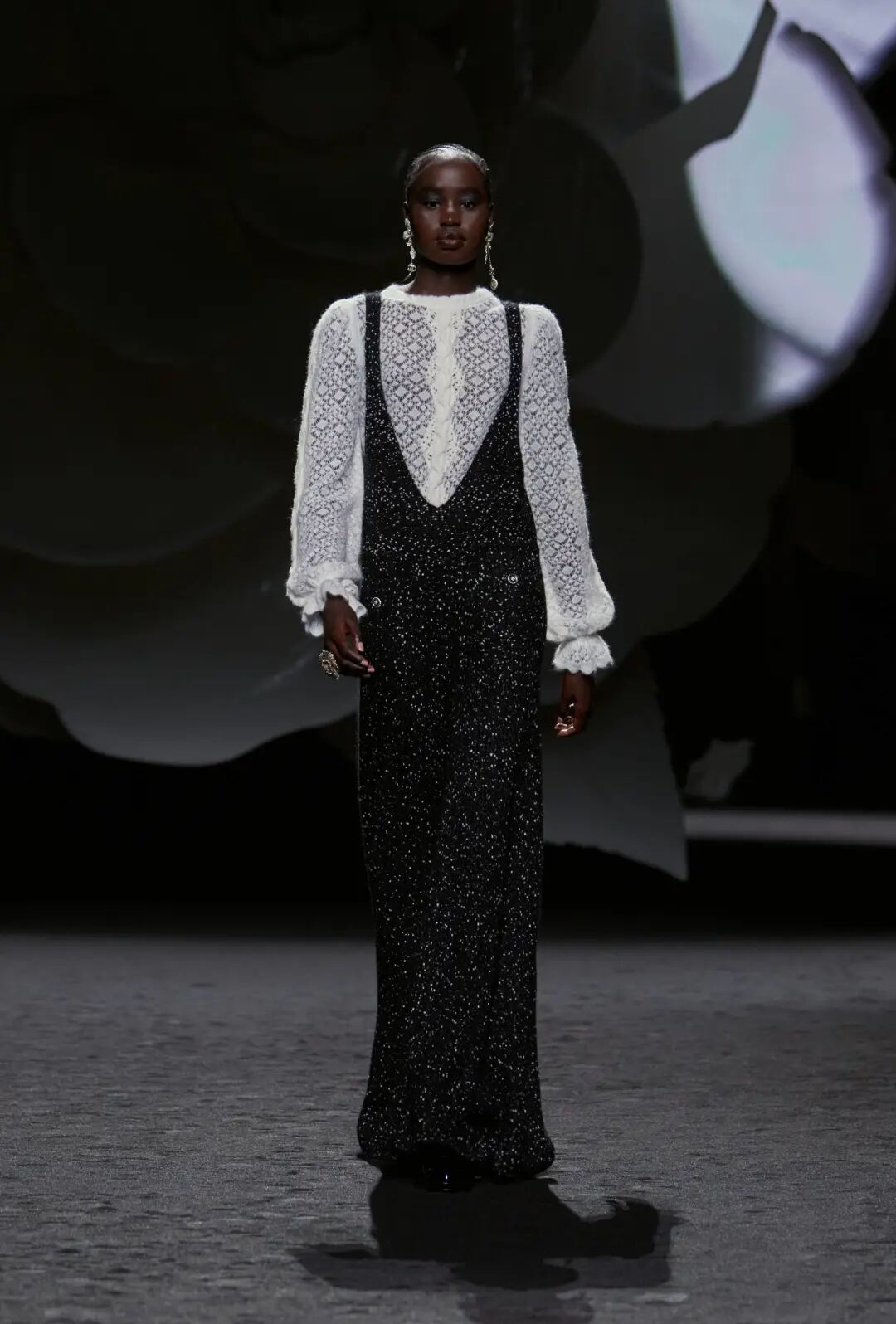 “探索人體構造、服裝解構、花卉形態。藉助精湛技藝與面料,探尋美與力量。聚焦剪裁、比例及廓形。時裝的本質源自人體結構,以此為靈感,呈現於精良剪裁之上。顛覆經典:內外翻轉,上下倒置,呈現或簡約光潔、或嚴格精確、或張揚有趣的形態。解構重塑時裝:切割、裁片、扭轉,突顯肩部廓形,收窄腰部曲線。褲子與長靴融為一體,延長腿部線條,構造出與品牌經典超低腰褲對立的廓形。作為該系列最主要的圖案,蘭花以其罕見的培植形態呈現,它是除雛菊外最常見的花卉之一。它在空氣中盛開,肆意生長,自由生根。它綺麗旖旎,極富適應性。它的姿態既像是捕獵者,又像是獵物。在花語中,它是愛的象徵。”創意總監 – Sarah Burton