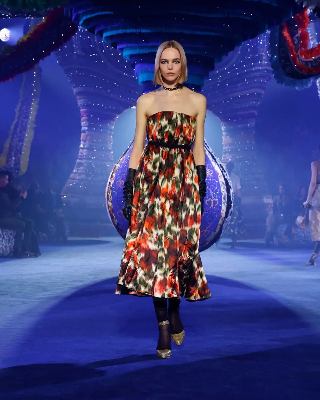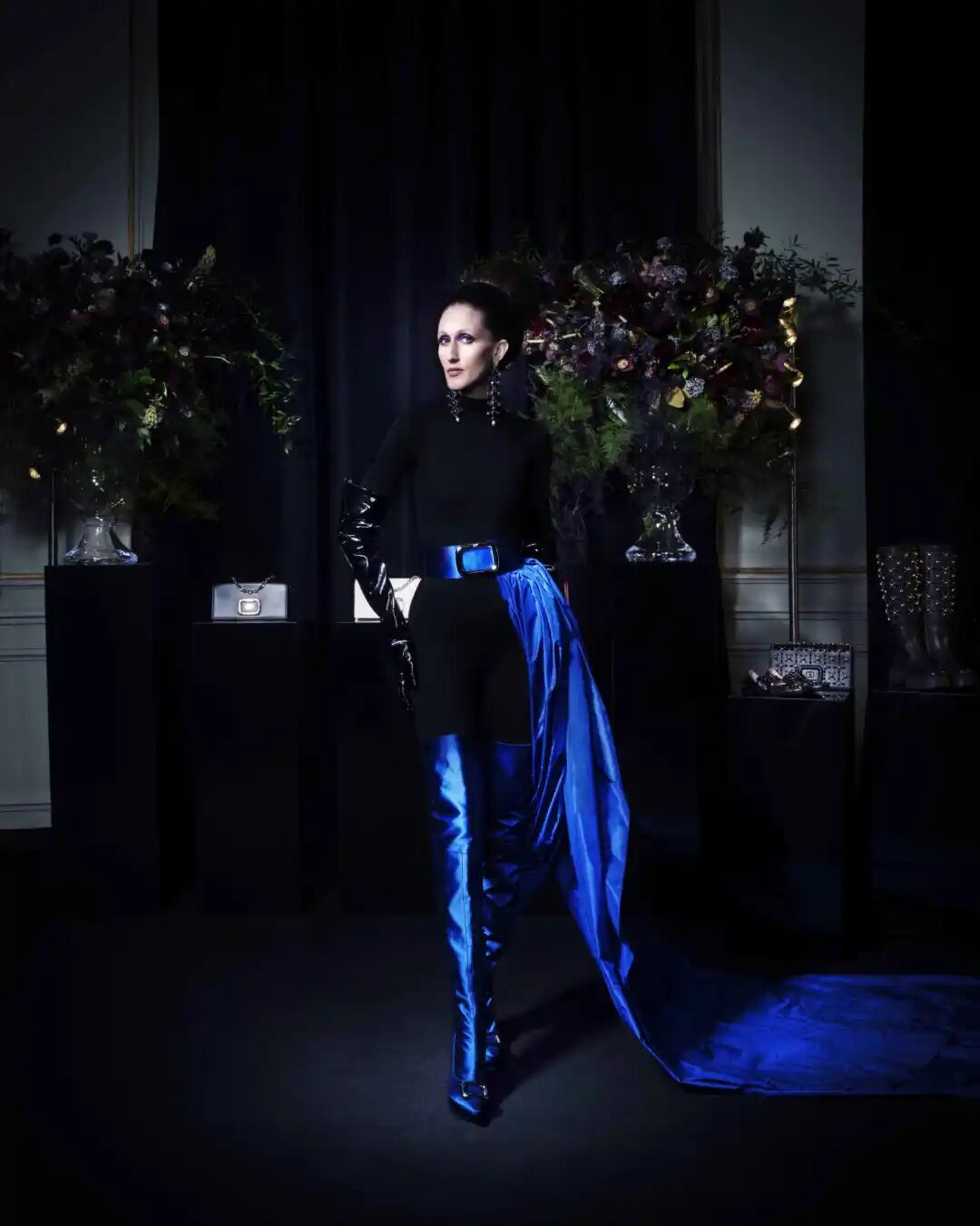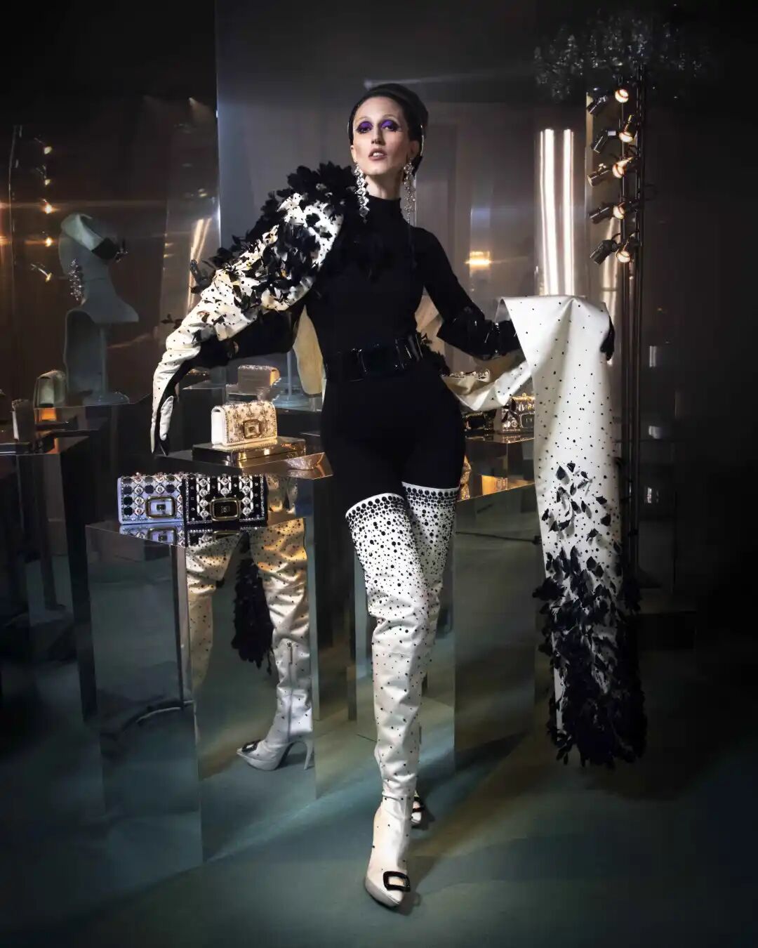 本次La Maison Vivier 傳奇宅邸中由一座緩緩升起的旋轉舞臺,翩然揭開屬於1950年代高級時裝秀的帷幕,格拉多·費羅尼先生以對時代儀典以及時裝模特的獻禮,以身著黑色華服的曼妙摩登女郎,呈現璀璨奪目的鞋履與配飾,淋漓詮釋造型的力量與性感。宅邸中設立六間展館「繁花幻想」、「緋紅秘境」、「鏡像時空」、「回溯酒舍」、「暗影展廳」、「手工工坊」,致敬羅傑·維維亞先生創作的雋永廓形,將服裝與身姿隱於幕後,而以精美配飾作為舞臺主角。