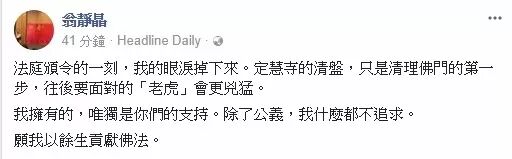 翁靜晶再留言﹕“法庭頒令的一刻,我的眼淚掉下來。定慧寺的清盤,只是清理佛門的第一步,往後要面對的『老虎』會更兇猛。我擁有的,唯獨是你們的支持。除了公義,我什麼都不追求。願我以餘生貢獻佛法。”