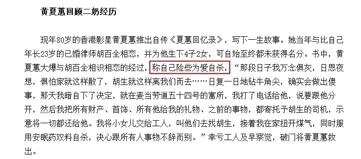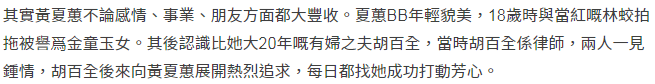 不過二人的分手原因倒不是這些,而是黃夏蕙的出軌。黃夏蕙19歲時,就通過飯局認識了大自己23歲、出身名門望族的“政商大亨”胡百全。然後就出軌了。