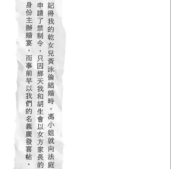胡百全的原配馮小姐呢,則極其不滿,還在黃夏蕙大女兒出生時百般阻攔,更是在黃夏蕙乾女兒結婚時申請禁令,讓其無法和胡百全以女方家長身份出席婚宴。