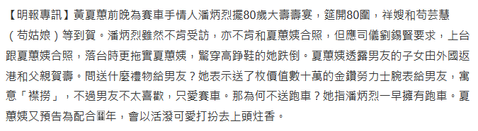 但據港媒報道,黃夏蕙操辦潘炳烈80大壽時,因準備不當導致坐席比預期要少了很多,許多藝人只能乾站著,場面十分尷尬,兩人還為此出了不小的矛盾。