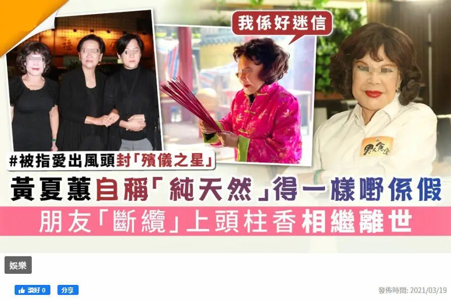 說來“殯儀之星”這個名號還是大劉為了諷刺黃夏蕙起的。原因如其名,只要香港名人誰有葬禮,她就會出現搶鏡頭。