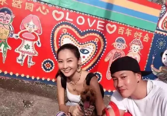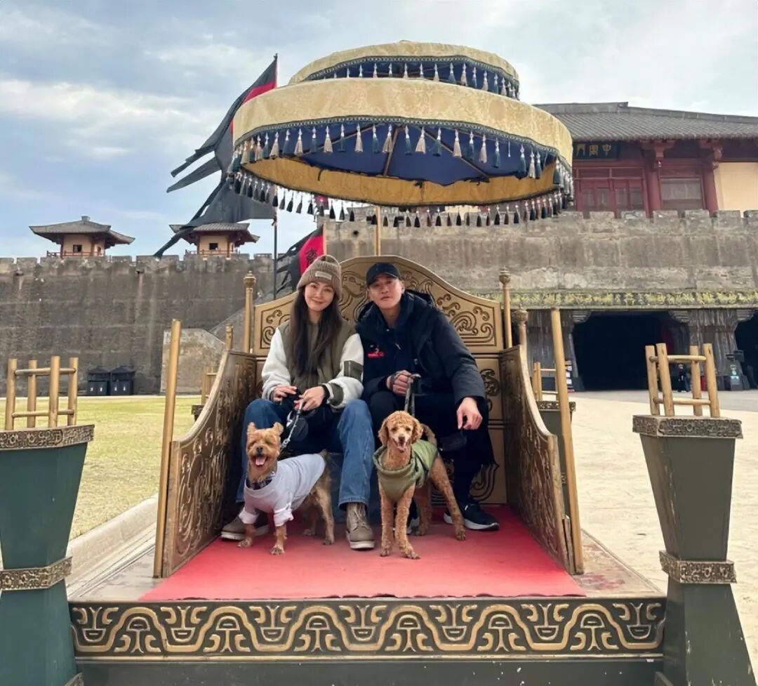 在Peggy曬出的照片裡,夫妻倆坐在椅子上並牽著愛犬,一家四口即視感↓