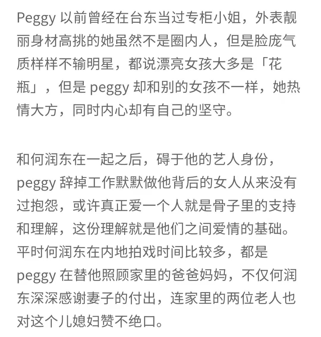 不過也因為Peggy曾經是櫃姐的身份,很多網友覺得Peggy與明星身份的何潤東並不匹配,因此兩人的戀愛也有很多唱衰的聲音。