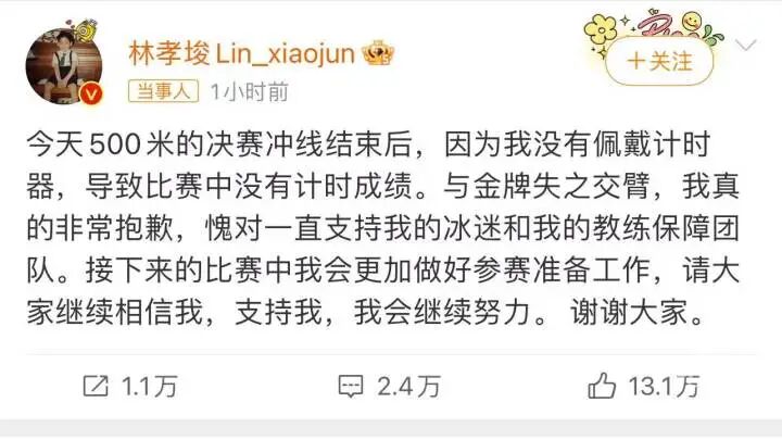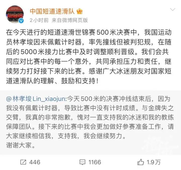 賽後,林孝埈發文回應短道速滑世錦賽500米決賽中被判犯規一事:“今天500米的決賽衝線結束後,因為我沒有佩戴計時器,導致比賽中沒有計時成績。與金牌失之交臂,我真的非常抱歉,愧對一直支持我的冰迷和我的教練保障團隊。接下來的比賽中我會更加做好參賽準備工作,請大家繼續相信我,支持我,我會繼續努力。”