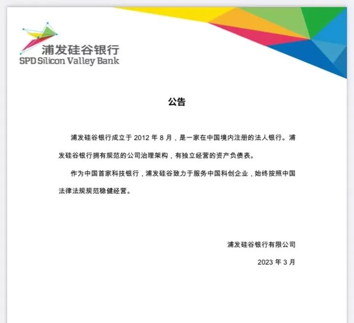 今天,浦發硅谷銀行發佈公告稱,浦發硅谷銀行擁有規範的公司治理架構,有獨立經營的資產負債表。作為中國首家科技銀行,浦發硅谷致力於服務中國科創企業,始終按照中國法律法規規範穩健經營。
