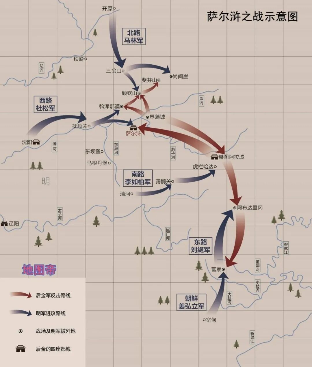 在這場被後世稱為“薩爾滸大戰”的戰役中,明朝四路大軍,外加朝鮮參戰的一路援軍遭到八旗部隊毀滅性的打擊。自此明朝再也無力組織起戰略層面的進攻行動,東北全境漸漸為後金所蠶食。