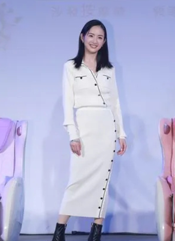 林依晨黑長直+白色紐扣緊身長裙,搭配細跟靴子,造型休閒又不失幹練,很適合她的這種介於少女和女人之間的氣質。