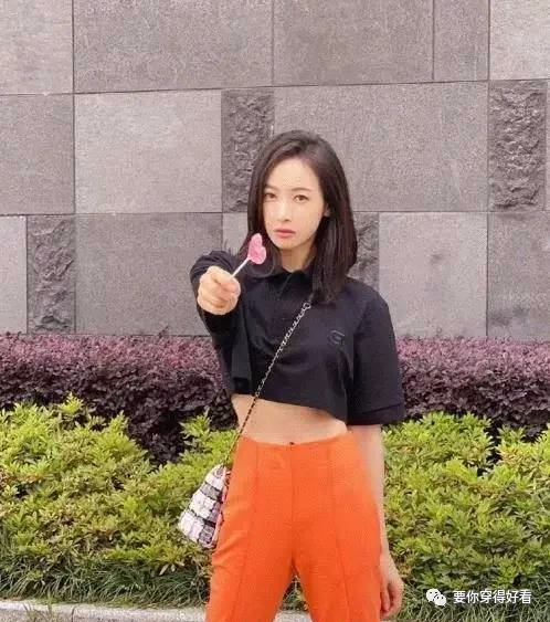 簡單黑色短T恤搭配橘色長褲,一米八大長腿分分鐘穿出來,另外這螞蟻腰太吸睛了,是身材的暴擊!