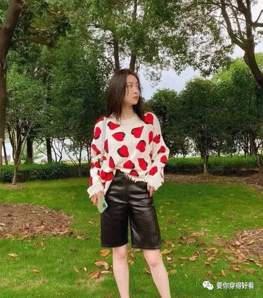 這套風格清新靚麗,白底愛心印花的毛衣既可愛又不失女人味,五分皮短褲個性帥氣,搭配小皮鞋慵懶率性,反季穿搭不失時尚氣息,茜茜子真是太會穿了。
