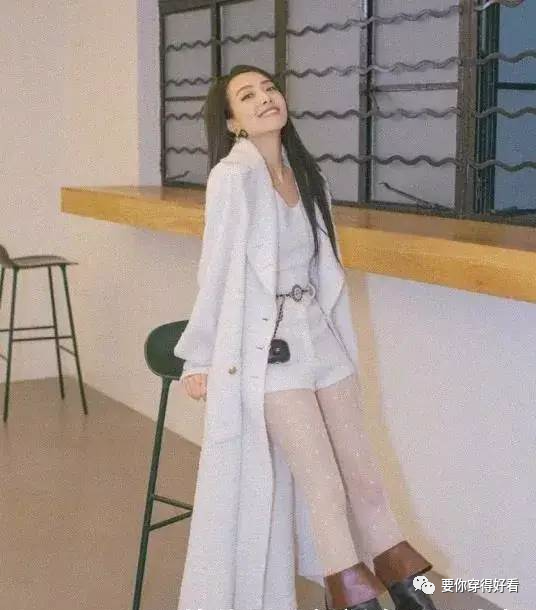 這套搭配高級時髦,是簡約又顯氣場的示範搭配,宋茜穿一件白色“毛巾絨”外套,搭配同款內搭,灑脫大氣,翻筒的黑色中靴和棕色拼接在一起,質感up,再搭配白色波點網襪,個性又時髦。
