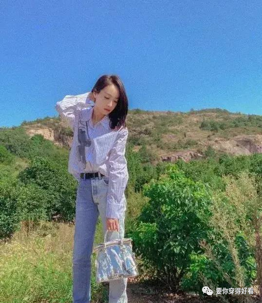 先來看這一套,條紋襯衫搭配藍色牛仔褲,清新甜美,黑色腰帶簡約優雅,分割了上半身和下半身,拉長了比例,一雙亮色的球鞋增添整體造型飽和度,上山召喚藍精靈的茜茜子在線狙擊你的心!