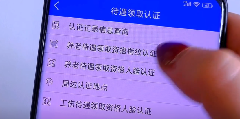 然後我們在這個界面點擊這個待遇領取認證,我們點擊一下,在這裡也有幾個選項,有認證記錄信息查詢,養老待遇領取資格指紋認證,還有一個是養老待遇領取資格人臉認證。