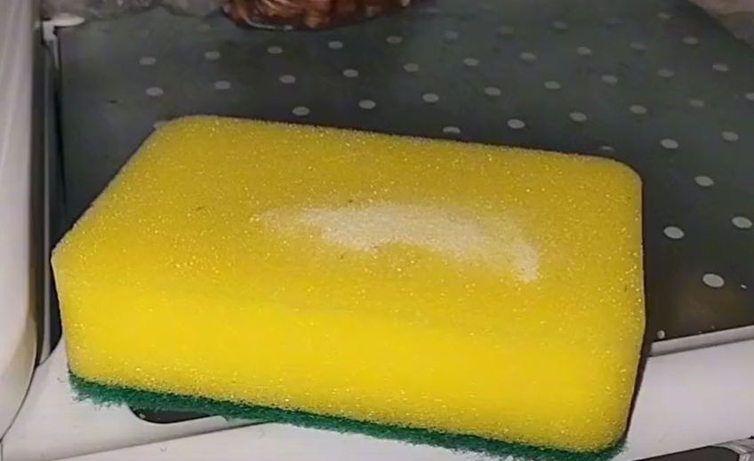 接著就可以把這個海綿擦放進冰箱裡邊,小蘇打既可以和酸性物質發生反應,也能與鹼性物質發生反應,這樣小蘇打可以和一些有氣味的物質發生反應,從而達到去除冰箱異味的效果。